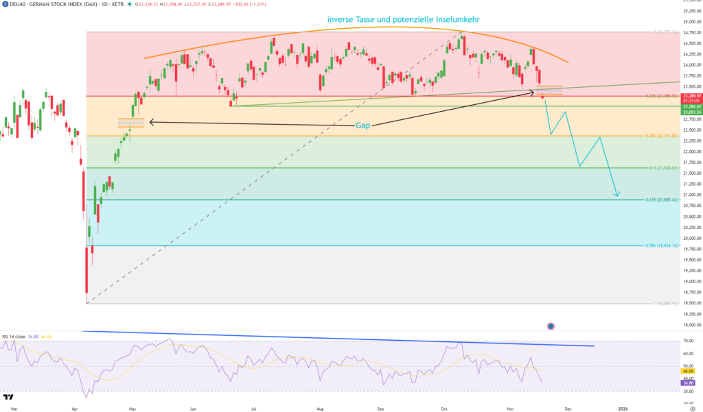 Nach einer lan­gen Ral­lye befin­det sich der DAX seit Mona­ten in einer über­ge­ord­ne­ten Seit­wärts­pha­se. Neue Hochs wur­den nur mini­mal über­schrit­ten oder gar nicht mehr erreicht, wäh­rend eine Abfol­ge unkla­rer Tiefs ent­stand – eine brei­te, aber unsau­be­re Ran­ge ohne kla­re For­ma­ti­on. Auf­fäl­lig sind schwä­cher wer­den­de Impul­se und eine abneh­men­de rela­ti­ve Stär­ke, was auf der Makro­ebe­ne eine deut­li­che Diver­genz und poten­zi­el­le Top­bil­dung signalisiert.