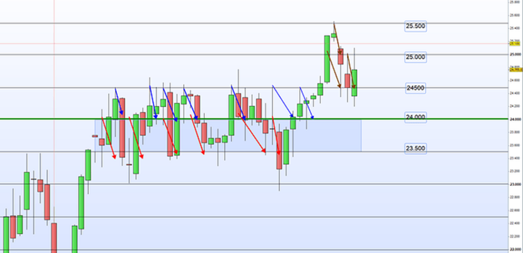 Beson­de­re Beach­tung ver­die­nen im Mor­gen­han­del zudem die Zonen­an­pas­sun­gen, die häu­fig bereits früh nach 09:00 Uhr erfor­der­lich wer­den. Gera­de sie kenn­zeich­nen die zugrun­de lie­gen­de Kurs­struk­tur beson­ders tref­fend und besit­zen erfah­rungs­ge­mäß eine hohe Zuver­läs­sig­keit für den wei­te­ren Handelserfolg.