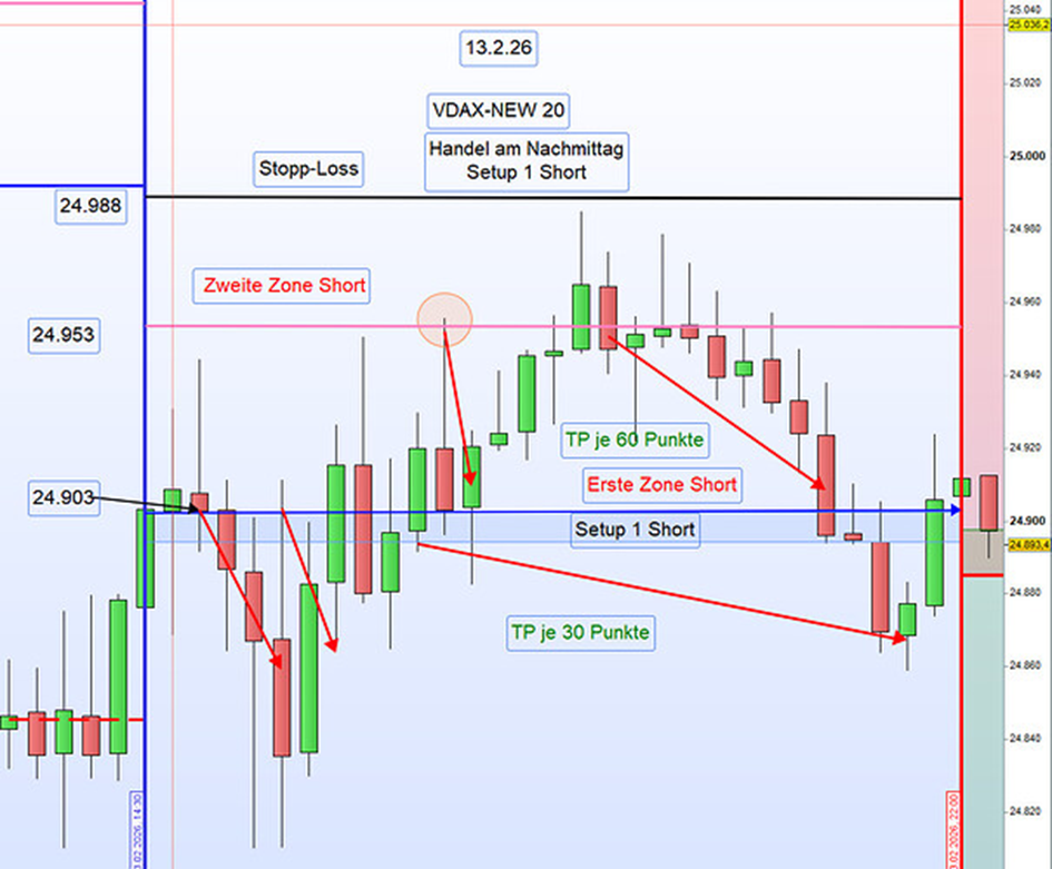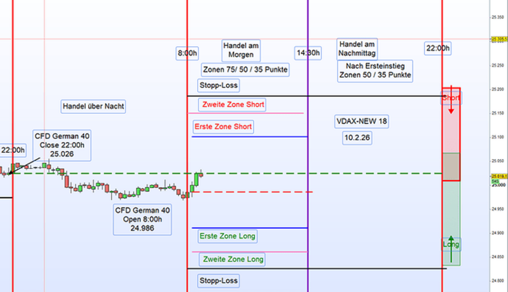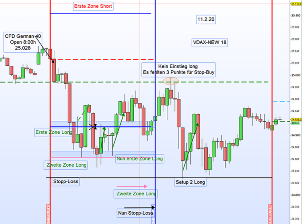 Im Mor­gen­han­del soll­te der Fokus zunächst aus­schließ­lich auf den zwei­ten Zonen lie­gen. Die­se stel­len erfah­rungs­ge­mäß die sta­tis­tisch sta­bils­ten Ein­stiegs­be­rei­che dar und bie­ten die größ­te Sicher­heit in der Umset­zung. Hier geht es nicht um Trade-Häu­fig­keit, son­dern um das sau­be­re Erler­nen von Zonen­lo­gik, Geduld und regel­kon­for­mer Positionsführung.