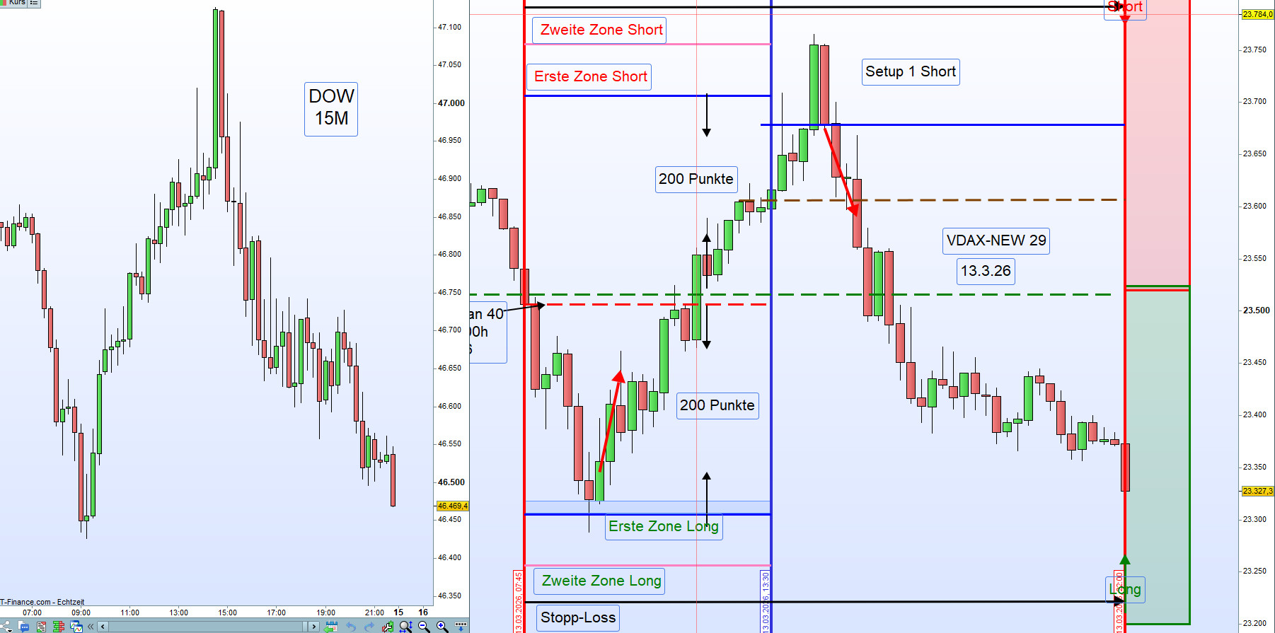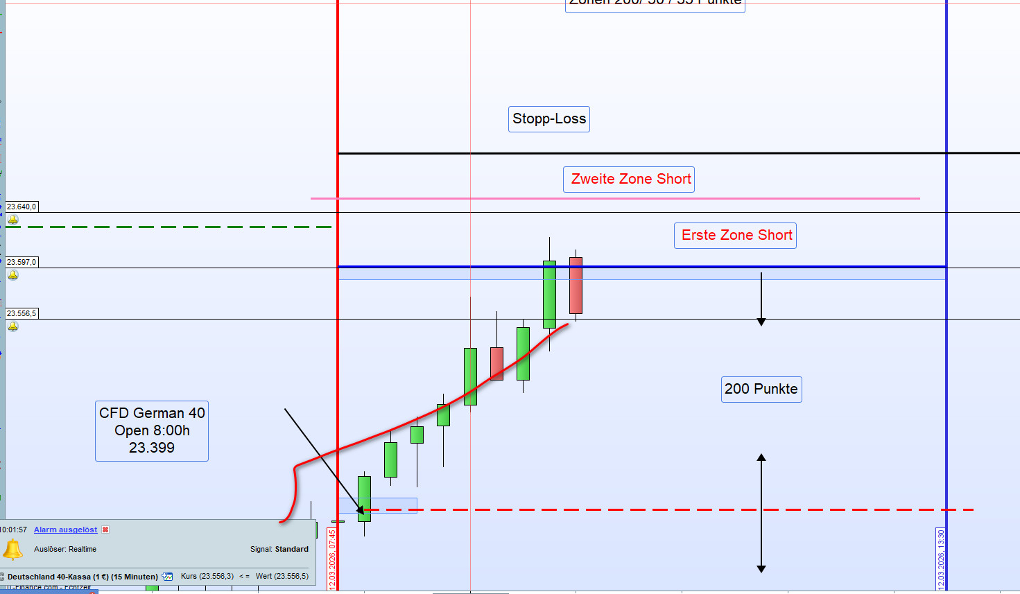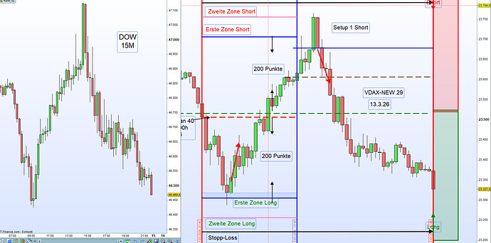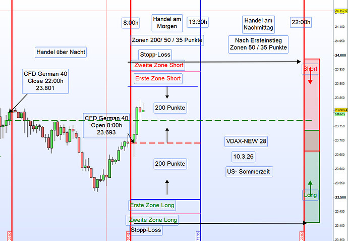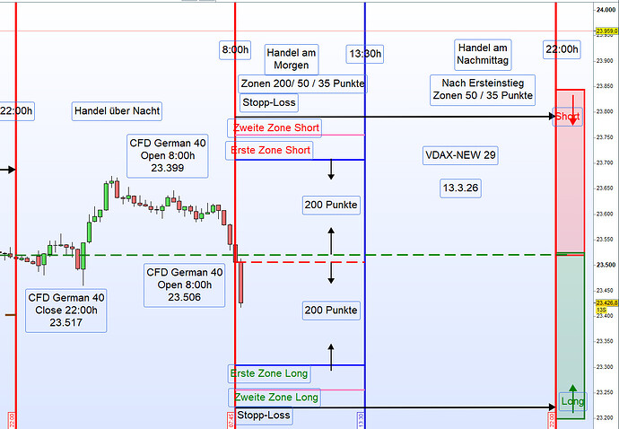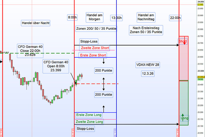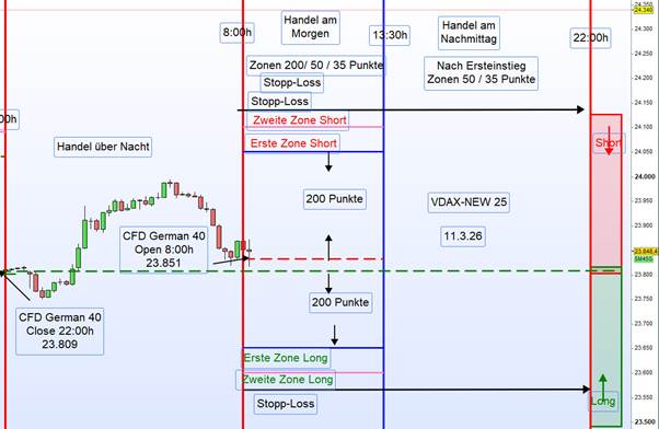 Am Morgen wurden die Handelszonen mit einem Abstand von 200 Punkten zum Eröffnungskurs definiert – sowohl für die erste Zone Long als auch für die erste Zone Short.