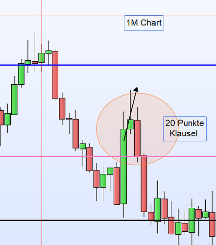 Der Kurs stieg danach erneut bis zur zweiten Zone. Eine weitere Positionseröffnung hätte auch hier mit Erfolg abgeschlossen werden können, wurde jedoch bewusst nicht ausgeführt, und zwar gemäß folgendem Regeltext.