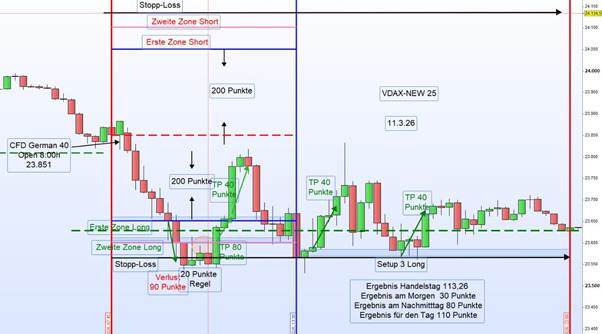 Am Vormittag konnte an der ersten Long-Zone regelkonform eine Long-Position eröffnet und mit einem Take Profit von 40 Punkten geschlossen werden.