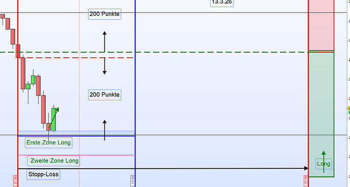Die erste Zone Short, rund 200 Punkte vom Eröffnungskurs entfernt, wurde zügig erreicht. Dort wurde regelbasiert eine Short-Position eröffnet und mit Gewinn geschlossen.