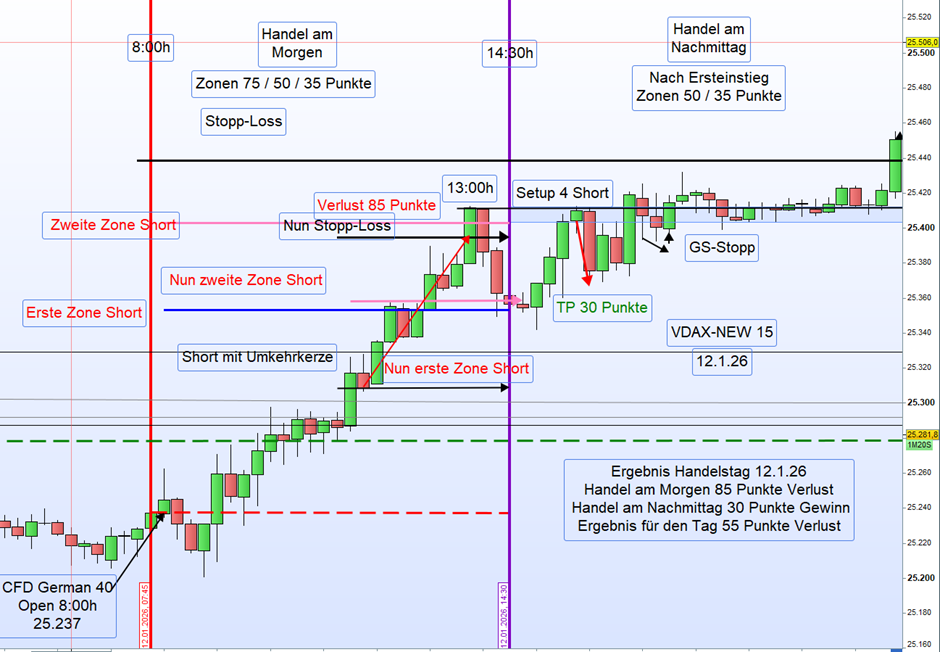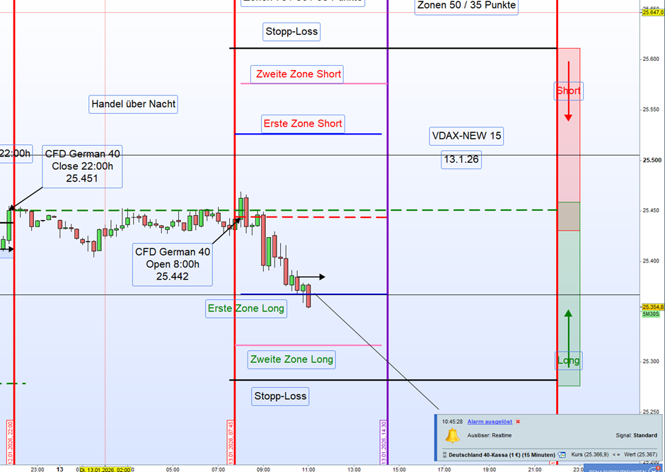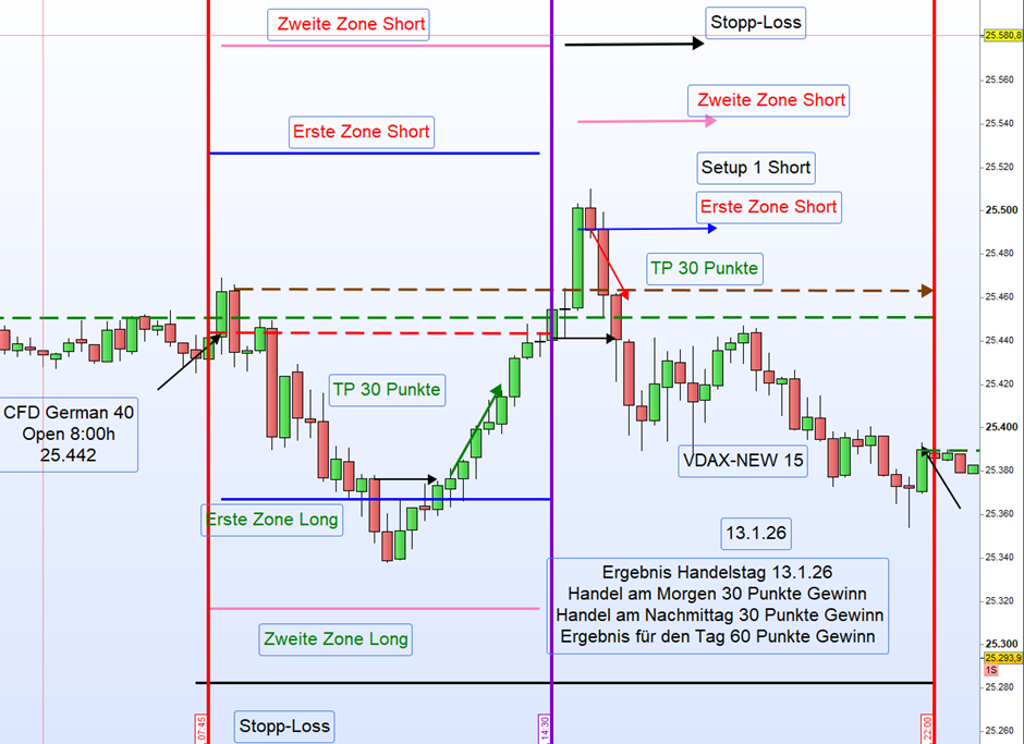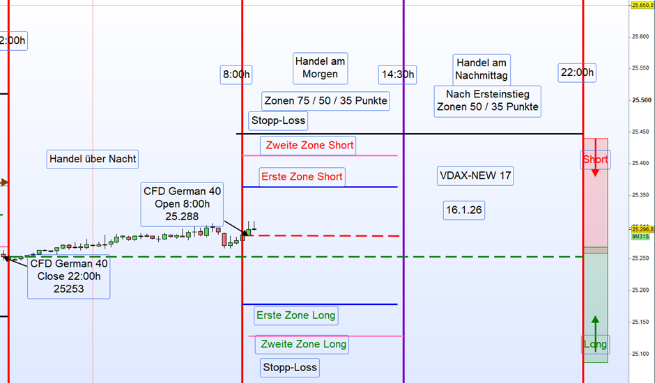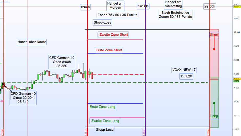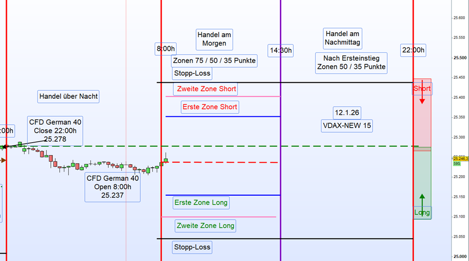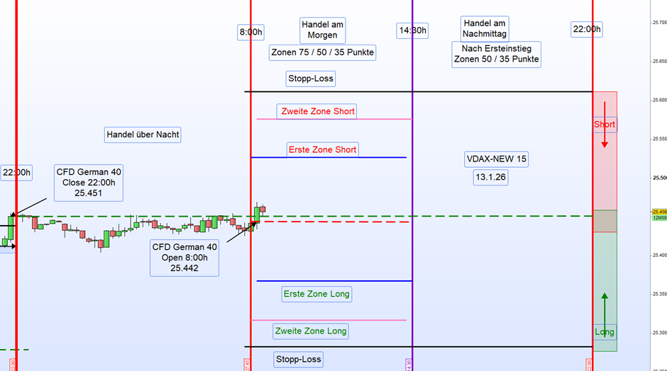 Ausgangsdaten: Schlusskurs am 12.01.2026 (22:00 Uhr): 25.451 Punkte Eröffnungskurs am 13.01.2026 (8:00 Uhr): 25.442 Punkte Gap: 25.442 − 25.451 = −9 Punkte (Down-Gap) VDAX-NEW: 15 (niedrige Volatilität) Marktumfeld: US-CFDs leicht im Minus, DAX leicht im Plus Da das Gap sehr klein ist, erfolgt der Handel im klassischen Zonenmodus, mit Short-Zonen über dem Schlusskurs und Long-Zonen unter dem Eröffnungskurs (wie am Vortag). Zonenfestlegung Short-Zonen (über dem Schlusskurs)