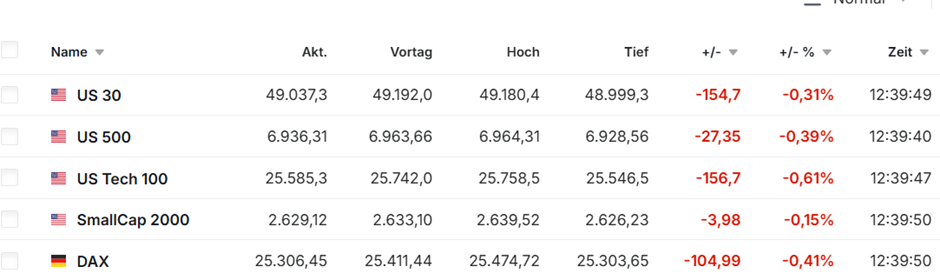 Der Dow Jones notiert aktuell mit etwa –0,80 % im Minus.