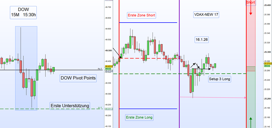 Seit dem Eröffnungskurs notierte der Markt zunächst unterhalb dieses Niveaus und durchlief dabei die erste Short-Zone, ohne ein verwertbares Setup zu liefern.