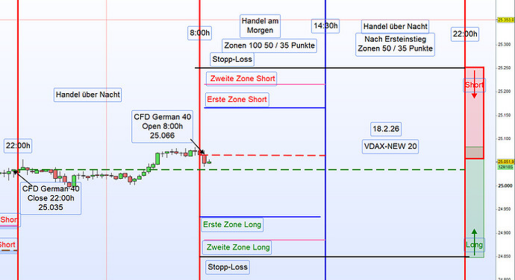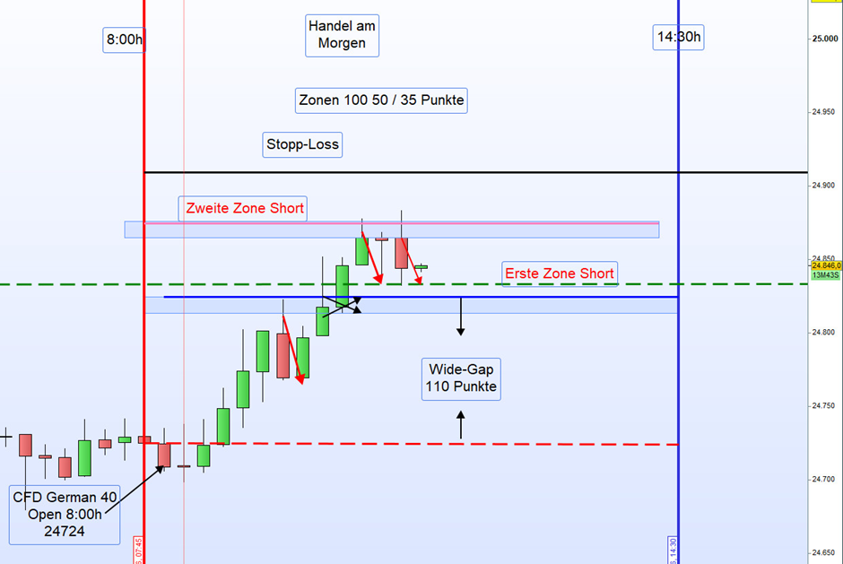 Bei klaren Vorgaben zum 08:00-Uhr-Eröffnungskurs – etwa durch ein deutliches Up-Gap oder Down-Gap in Verbindung mit bereits stark im Gewinn oder Verlust notierenden CFDs – kann in Erwägung gezogen werden, direkt in Marktrichtung zu handeln.
