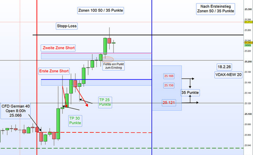 Gemäß der erhöhten VDAX-Notierung wurde die erste Short-Zone 100 Punkte über dem Eröffnungskurs gelegt.