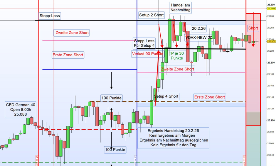 Trotz der insgesamt schwachen Tagesstruktur konnten regelbasiert mit Setup 1 Long sowohl an der ersten als auch an der zweiten Zone kleinere Gewinne erzielt werden.