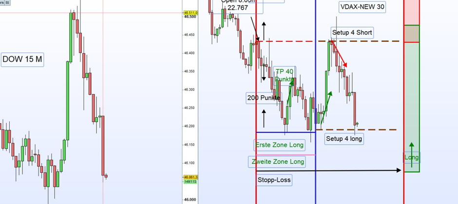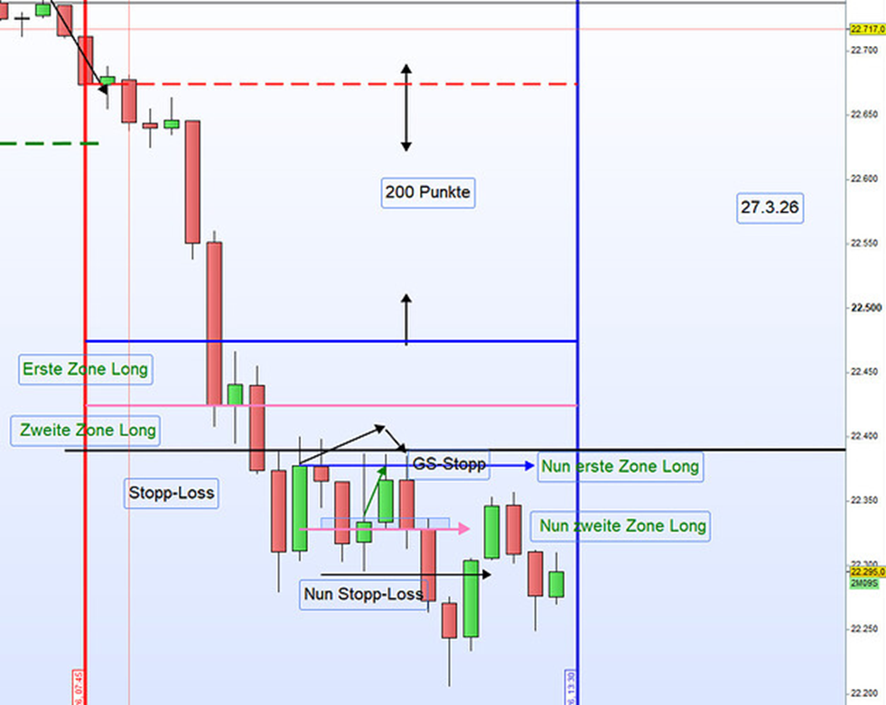 Nach der Eröffnung korrigierte der Kurs unerwartet sehr stark nach unten. Zwei sehr lange Wide Range Bars (WRB) durchquerten dabei die erste Long-Zone, die 200 Punkte unter dem Eröffnungskurs situiert ist, ohne nennenswerte Reaktion.