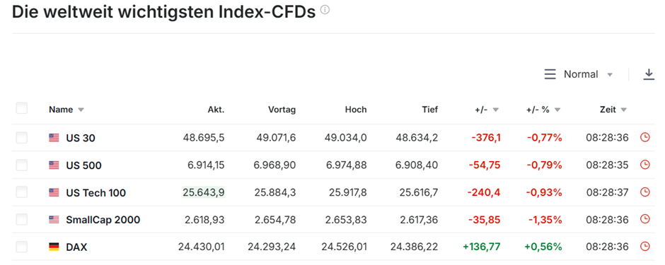 Die CFDs auf die weltweit wichtigsten Indizes werden auf den sogenannten Cash-Index gepreist. Die Index-CFDs sind 24 Stunden am Tag verfügbar mit aktuellem Kurs, Tageshoch und -tief sowie die prozentuale Veränderung für jeden Index. Der "Basispreis" ist der letzte tatsächliche Schlusskurs jedes Index und die Veränderung wird aus dieser Basis berechnet. Der Erwerber eines CFDs (Contracts for Difference) ist nicht an einem Unternehmen beteiligt, sondern lediglich Inhaber einer Forderung. Der Kurs von CFDs leitet sich von einem Basiswert ab. Der Anleger wird ausschließlich an der Kursentwicklung des Basiswertes beteiligt. CFDs zählen zur Gruppe der Derivate.