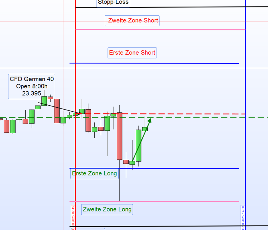 Fazit: Regel­ba­sier­ter Short-Han­del am Vor­mit­tag, Posi­ti­on kor­rekt nach SK been­det. An der zwei­ten Zone kein Trade auf­grund Zeitregel.