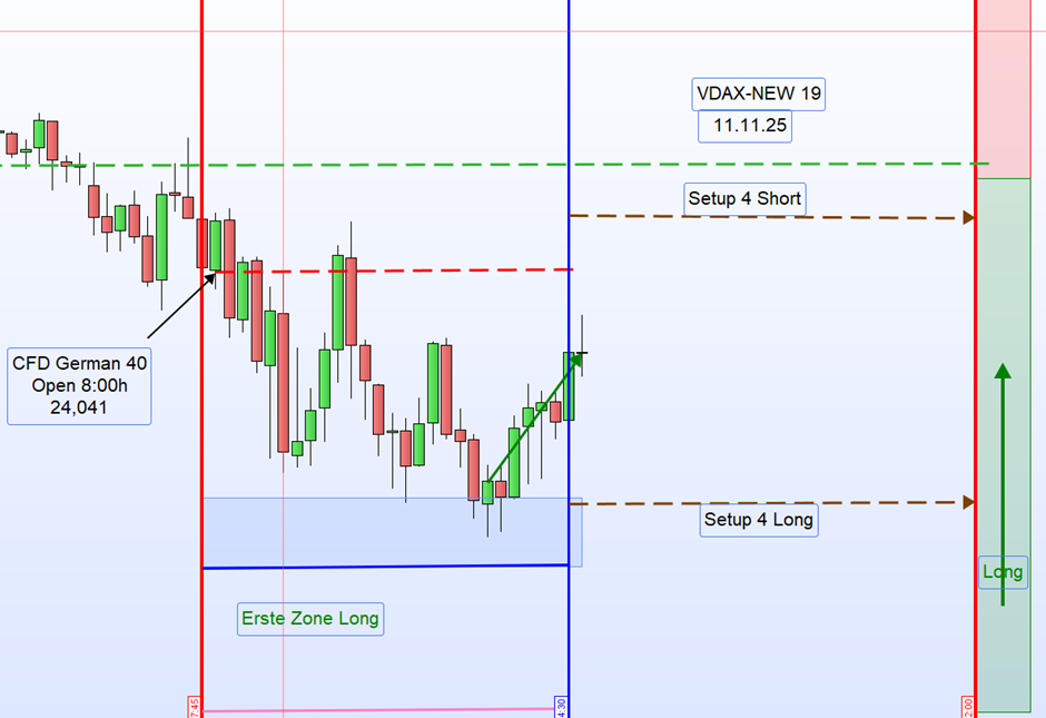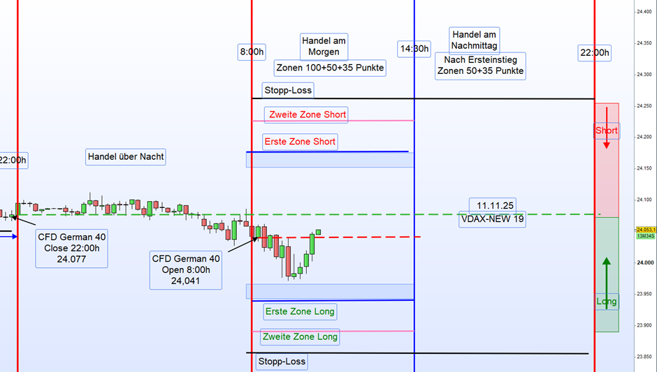 Heu­te Mor­gen, am 11.11.2025 um 8:00 Uhr, eröff­ne­te der Markt bei 24.041 Punk­ten, was einem Down-Gap von 36 Punk­ten entspricht.