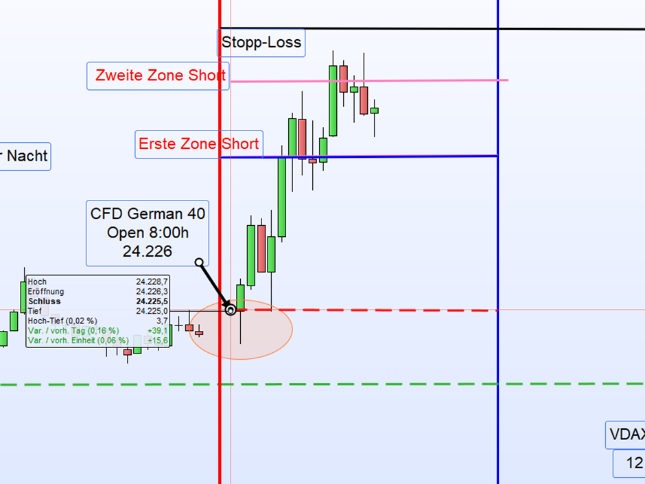 Der Kurs stieg vom Eröff­nungs­kurs direkt bis zur ers­ten Zone. Dort wur­de 10 Punk­te dar­un­ter eine Short-Posi­ti­on eröff­net, die mit 40 Punk­ten Gewinn geschlos­sen wer­den konn­te. Eigent­lich hät­te der Ein­stieg erst nach einer ein­deu­ti­gen Umkehr­ker­ze erfol­gen sol­len, da der Eröff­nungs­kurs zwi­schen 8 und 9 Uhr nicht unter­schrit­ten wurde.