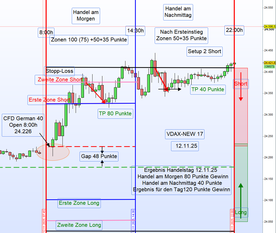 Heu­te Mor­gen, am 12.11.2025 um 8:00 Uhr, eröff­ne­te der Markt bei 24.226 Punk­ten, was einem Up-Gap von 48 Punk­ten entspricht.