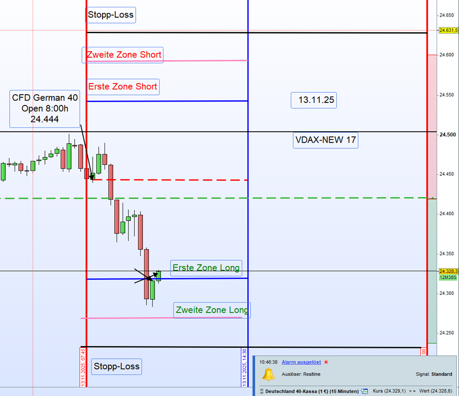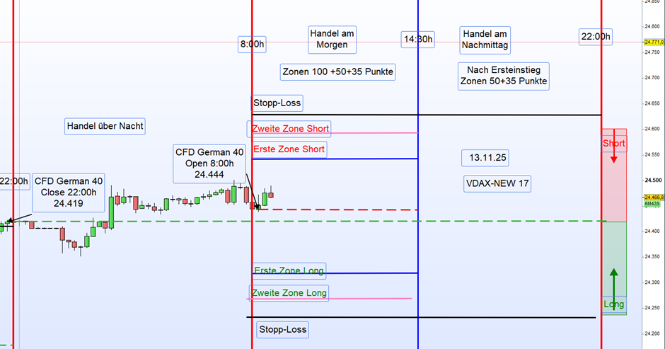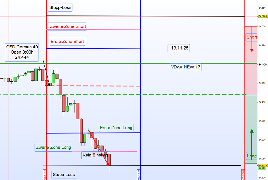 Heu­te, am 13.11.2025 um 8:00 Uhr, eröff­ne­te der Markt bei 24.444 Punk­ten, was einem Up-Gap von 25 Punk­ten entspricht.