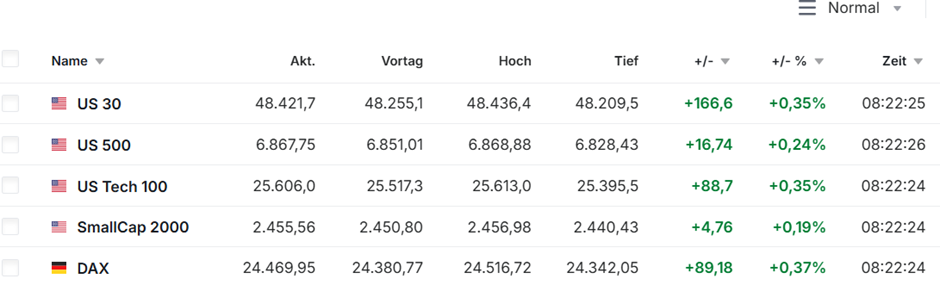 Die CFDs der US-Majors und des DAX notie­ren heu­te Mor­gen alle im Plus.
