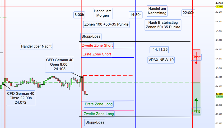 Heu­te, am 14.11.2025 um 8:00 Uhr, eröff­ne­te der Markt bei 24.106 Punk­ten, was einem Up-Gap von 34 Punk­ten entspricht.