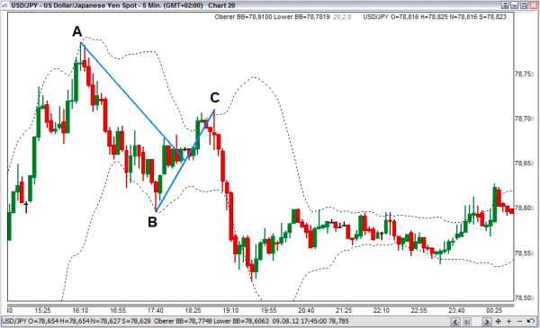 Diese Gabel entsteht wie folgt: Als Erstes werden im Chart drei Punkte lokalisiert. Im Abwärtstrend werden zwei relative Hochpunkte und ein Tiefpunkt gesucht und im Aufwärtstrend zwei relative Tiefpunkte und ein signifikantes Hoch. Die Andrew’s Pitchfork stellt einen Trendkanal dar, der Widerstände und Unterstützungen im Chart anzeigt. Um relative Hochs beziehungsweise Tiefs einfacher im Chart zu bestimmen, verwenden wir die Bollinger-Bänder in ihren Standardeinstellungen (Periode 20, Deviation 2). Die Hoch- bzw. Tiefpunkte zur Konstruktion der Pitchfork sollten auf Höhe der Bollinger-Bänder liegen. Punkte innerhalb der Bänder werden für diese Strategie nicht gewählt, da sonst die Methode zu ungenau wird. Man sollte also nicht jeden Hoch- oder Tiefpunkt im Chart wählen, sondern ausschließlich signifikante, durch die Bollinger-Bänder bestätigte Punkte wählen (Abbildung 1). Andrews konnte damals die Bollinger-Bänder noch nicht einsetzen, weil sie erst in den 1980er-Jahren von John Bollinger entwickelt wurden.