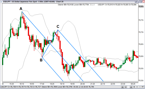 Weiterhin müssen diese Punkte Wendepunkte innerhalb eines Trends sein, das heißt eine Korrektur einleiten. Im Abwärtstrend wird also zuerst ein Hochpunkt (A) bestimmt und als nächstes ein Tiefpunkt (B) festgelegt, von dem aus eine Korrektur startet. Diese Korrektur endet im Punkt C, der wiederum ein Hochpunkt ist. Vom Punkt C aus startet die Bewegung wieder in Richtung des Haupttrends (hier Abwärtstrend). Zur Konstruktion der Pitchfork wird wie folgt vorgegangen. Wir verbinden die Punkte B und C. Vom Punkt A aus ziehen wir eine Gerade durch die Mitte der Strecke von B zu C (Abbildung 2). Dies ist die Median Line. Durch die Punkte B und C wird jeweils eine Parallele zur Median Line oder Mittellinie (ML) gezogen. Somit entsteht die Pitchfork (Abbildung 3). Die Mittellinie wirkt als eine Unterstützungs- und Widerstandslinie. Andrews hat damals mit Bleistift und Papier diese Linien eingezeichnet. Heutzutage erledigt die Chartsoftware die Arbeit für Sie. Sie bestimmen lediglich drei relevante Punkte im Chart und die Pitchfork wird automatisch gezeichnet. Idealerweise liegt Punkt C auf einem relevanten Fibonacci-Retracement (38,2%; 50% oder 61,8 %) der Strecke AB und bildet dort eine Umkehrkerzenformation. Als Unterstützung könnte man auch einen Oszillator einsetzen, der vom überkauften Bereich in den neutralen wechselt. Im Seitwärtstrend liegt der Punkt A innerhalb der Spanne von B nach C.