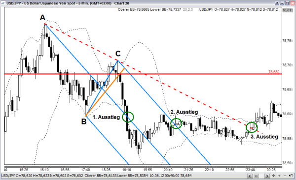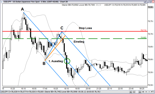 Vom Punkt B aus wird eine sogenannte Triggerlinie über die Tiefs der Kerzen gezogen, die zwischen B und C liegen (Abbildung 4, orange Linie). Diese Linie ziehen wir bis zur gegenüberliegenden Seite des Trendkanals. Wird diese Triggerlinie nach unten durchbrochen, so erfolgt der Einstieg in den Trade mit drei Positionen beziehungsweise Lots short. Dies ist wichtig, da wir bei dieser Strategie auch drei verschiedene Exits haben. Unseren Initial Stop-Loss legen wir knapp oberhalb des Punktes C. Erstes Ziel ist die Mittellinie der Pitchfork. Da wir nicht wissen, wann der Kurs die Mittellinie erreicht oder ob die Mittellinie überhaupt erreicht wird, kann auch kein CRV bestimmt werden. Wir können jedoch unsere Positionsgröße genau bestimmen, da wir einen klar definierten Stop-Loss haben. In 80 % der Fälle wird die Mittellinie erreicht, wenn die Triggerlinie gebrochen wurde. Danach könnte der Kurs weiterlaufen oder beginnt eine Bewegung zurück in Richtung Punkt C. Wird die Mittellinie nicht erreicht, ist dies ein Signal, dass der Trend nicht stark genug ist, und könnte später als Umkehrsignal gewertet werden.