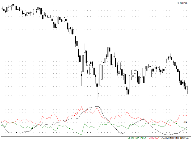 In Abbildung 1 ist der ADX im separaten Fenster dargestellt. +DI in grün, -DI in rot und der ADX in schwarz, jeweils in der Standardeinstellung von 14 Tagen.