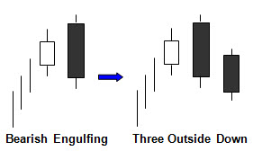Engulfing: Der Körper der zweiten Kerze muss den der ersten Kerze vollständig umschließen. Eine Bestätigung ist sinnvoll.Folgt auf das Bearish Engulfing eine schwarze Kerze mit niedrigerem Kursniveau, entsteht ein Three Outside Down. Dies ist eine starke Umkehrformation mit starkem Verkaufssignal. Keine Bestätigung mehr nötig.