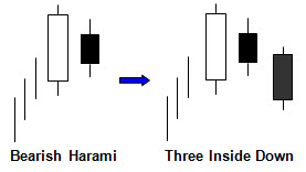 Harami: Der Körper der ersten Kerze muss den der zweiten Kerze vollständig umschließen. Eine Bestätigung ist sinnvoll. Folgt auf das Bearish Harami eine schwarze Kerze mit niedrigerem Kursniveau, entsteht ein Three Inside Down. Dies ist eine starke Umkehrformation mit starkem Verkaufssignal. Keine Bestätigung mehr nötig.
