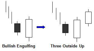 Engulfing: Der Körper der zweiten Kerze muss den der ersten Kerze vollständig umschließen. Eine Bestätigung ist sinnvoll. Folgt auf das Bullish Engulfing eine weiße Kerze auf höherem Kursniveau, entsteht ein Three Outside Up. Dies ist eine sehr starke Umkehrformation mit starkem Kaufsignal. Keine Bestätigung mehr nötig.