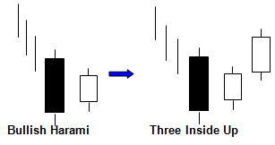 Harami: Der Körper der ersten Kerze muss den der zweiten Kerze vollständig umschließen. Eine Bestätigung ist sinnvoll. Folgt auf das Bullish Harami eine weiße Kerze auf höherem Kursniveau, entsteht ein Three Inside Up. Dies ist eine sehr starke Umkehrformation mit starkem Kaufsignal. Keine Bestätigung mehr nötig.