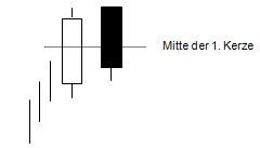 Die erste weiße Kerze ist lang. Die zweite schwarze Kerze eröffnet auf einem neuen Höchstkurs und schließt innerhalb der 1. Kerze in der unteren Hälfte. Relativ starkes Signal, keine Bestätigung mehr nötig.
