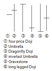 Sind Eröffnungs- und Schlusskurs gleich, werden sie als Dojis bezeichnet. Dojis können obere und/oder untere Schatten unterschiedlicher Länge besitzen. Dojis sind sehr wichtige Kerzen. Sie weisen auf eine Pattsituation zwischen Bullen und Bären hin. Sie tauchen oft in der Nähe von Unterstützungen oder Widerständen auf, von Hochs oder Tiefs. Dojis alleine generieren kein Kauf- oder Verkaufssignal. Es müssen die nächsten ein bis zwei Tagen abgewartet werden, ob sich eine Umkehrformation ausbildet. Werden Dojis während einer Rallye ausgebildet, bestätigen sie den Trend.