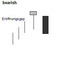 Gap zwischen erster und zweiter Kerze. Gap zwischen 2. und 3. Kerze hilfreich. Erste und dritte Kerze sind starke Kerzen. Farbe der zweiten Kerze unwichtig. Starkes Signal, keine Bestätigung nötig. Ist die zweite Kerze ein Doji, nennt sich die Formationen Evening Doji Star. Dadurch wird die Aussagekraft der Formation erhöht.