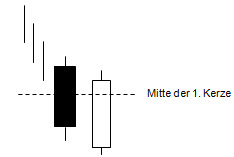 Die erste schwarze Kerze ist lang. Die zweite weiße Kerze eröffnet auf einem neuen Tiefststand und schließt innerhalb der 1. Kerze in der oberen Hälfte. Relativ starkes Signal, keine Bestätigung mehr nötig.