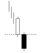 Jede Kerze eröffnet innerhalb des vorangegangen Körpers. Die drei Kerzen schließen nahe dem Tief. Starkes Verkaufssignal, keine Bestätigung nötig.