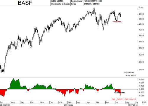 Ein CMF unterhalb der Nulllinie deutet auf Abgabedruck hin, es wird also distributiert. Der Indikatorwert befindet sich dann im roten Bereich. Werden tiefere Tiefs ausgebildet, nimmt der Verkaufsruck zu. Im beigefügten Beispiel hat der Verkaufsdruck in den letzten Tagen deutlich zugenommen, obwohl der Kurs (noch) kein tieferes Tief ausgebildet hat, ist der CMF regelrecht abgestürzt.