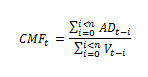 Im letzten Schritt wird aus dem Volumen-gewichteten CLV (= AD-Wert) der CMF berechnet. Dazu wird der AD-Wert über n-Tage aufsummiert und durch das ebenfalls über n-Tage aufsummierte Handelsvolumen dividiert. Chaikins schlägt als Standardeinstellung 21 Tage vor. Das entspricht ungefähr einem Handelsmonat. Wird die Periodenanzahl größer gewählt, ist der Indikator weniger volatil und weniger anfällig für Seitwärtsbewegungen. In einem Wochenchart oder Monatschart sollte die Periodenanzahl reduziert werden.
