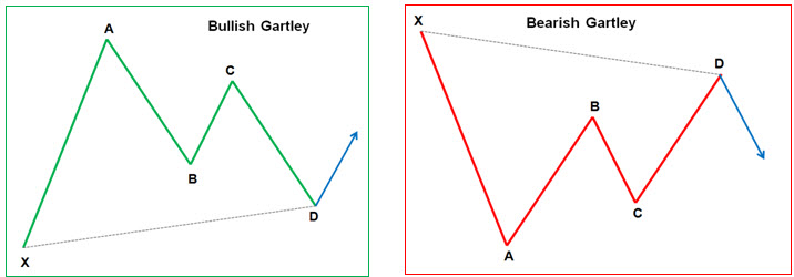 Die linke Grafik in bullischem Grün zeigt ein „bullisches Gartley Muster“, die rechte Grafik in bearischem Rot zeigt ein „bearisches Gartley Muster“.