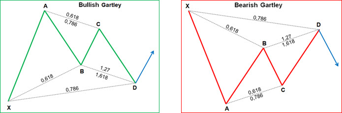 Die Aufwärtsbewegung XA endet mit einer Umkehr an A. Die Korrektur AB endet bei B, am 62% Retracement von XA, dargestellt durch die gepunktete graue Linie XB. Bei B dreht der Kurs wieder in die von XA vorgegebene Richtung. Idealerweise endet BC zwischen dem 62% und 79% Retracement von AB, dargestellt durch die gepunktete graue Linie AC. Bei C dreht der Kurs erneut entgegen die Haupttrendrichtung (vorgegeben durch XA). Die zweite Korrektur CD sollte 127% bis 162% Ausdehnung der ersten Korrektur AB erreichen, dargestellt durch die gepunktete graue Linie BD. Diese zweite Korrektur endet bei D. Die Gesamtkorrektur AD endet idealerweise am 79% Retracement von XA, dargestellt durch die gepunktete graue Linie XD. D ist der Einstiegspunkt für Kauf/Long (bullish Gartley) oder Verkauf/Short (bearish Gartley).