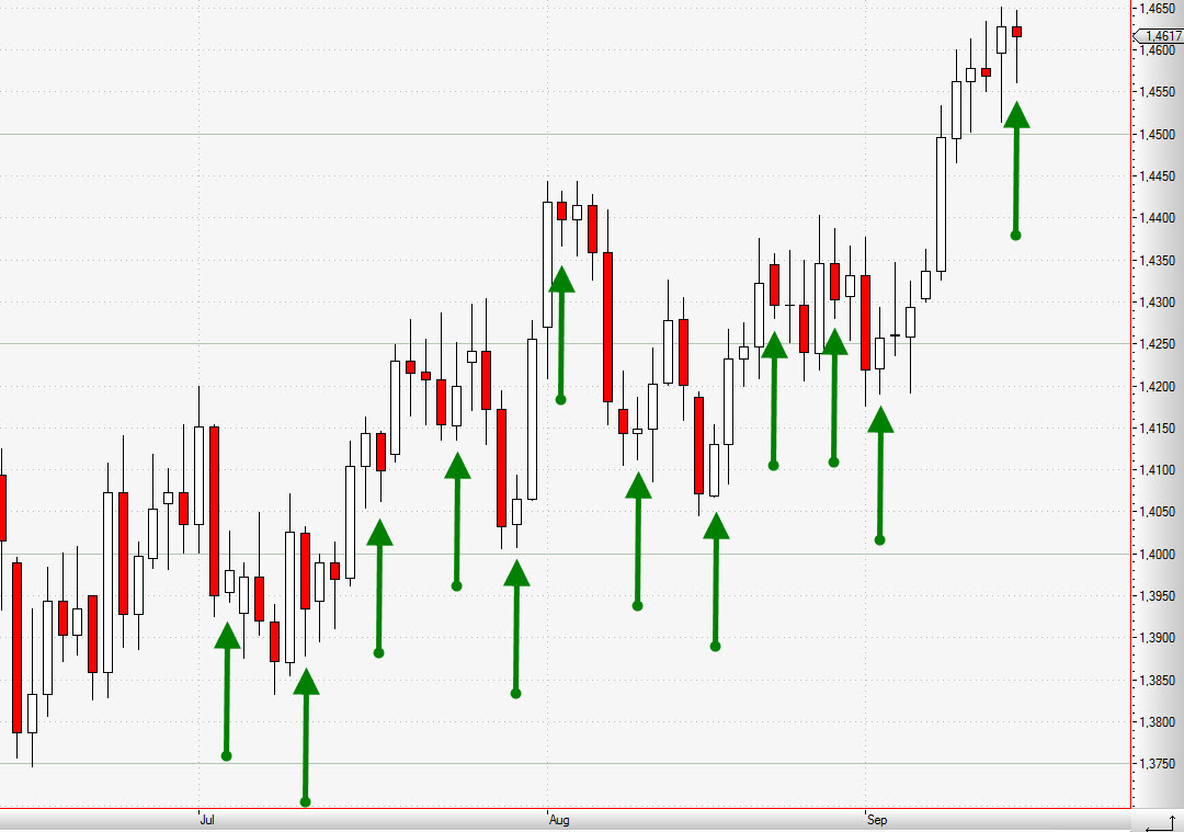 In Abbildung 1 ein Tageschart des EURUSD mit sehr vielen Inside Days.