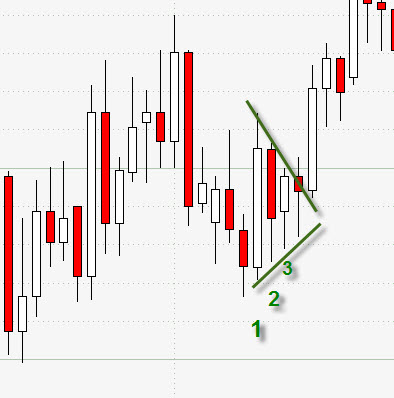 In kurzen Zeithorizonten kann eine Folge von Inside Bars auftreten, die einem Dreieck sehr ähnlich sind, dargestellt in Abbildung 2, einem Stundechart von EURUSD. Candle 1 umschließt Candle 2 und die umschließt Candle 3. Es folgt ein Ausbruch über die obere Dreiecksbegrenzung.
