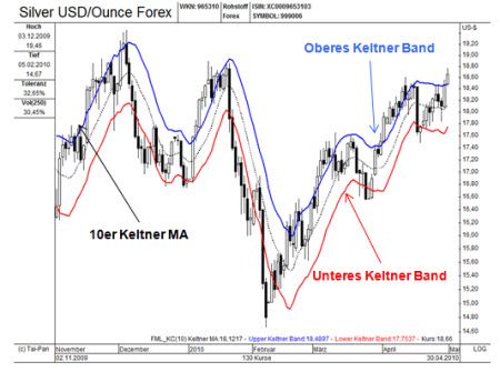 In Abbildung 1 ist der Silberpreis in USD, Daily, mit dem Keltner-Channel. Im Chart ist deutlich zu erkennen wie der Keltner-Channel um den Kurs „mäandert“. In Zeiten geringer Volatilität liegen das untere und das obere Keltner Band dicht beim Keltner-GD, werden die täglichen Handelsspannen größer, so entfernen sich die beiden Bänder von ihrem GD.