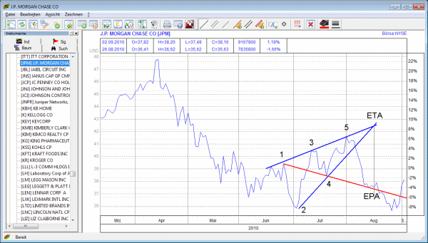Eine bearishe WolfeWave hat die Aktie der J.P. Morgan Chase & Co. zwischen Juni und August 2010 ausgebildet. Auch hier wurde das Kursziel (EPA) zum Zeitziel (ETA) erreicht (Abbildung 3).