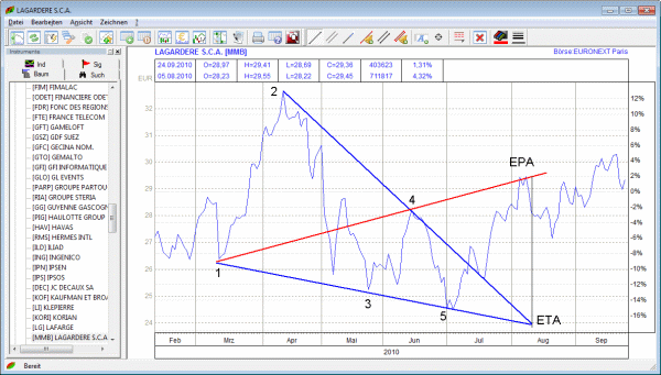 Eine bullische WolfeWave hat die Aktie der Lagardère S.C.A. von März bis August 2010 ausgebildet. Das Kursziel (EPA) wurde zum Zeitziel (ETA) erreicht (Abbildung 2).
