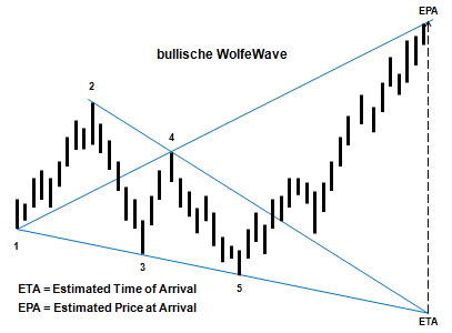 Die WolfeWave Formation wurde von Bill Wolfe ( https://www.wolfewave.com ) erstmals beschrieben und ist nach ihm benannt. Sie begründet sich auf der Annahme, dass die Bewegung in den Märkten nicht anders ist als die in den Ozeanen. Beide folgen den gleichen physikalischen Gesetzen. Sobald diese verstanden werden, können die Hochs und Tiefs jeden Marktes mit verblüffender Genauigkeit vorhergesagt werden. Die WolfeWaves wurden zum ersten Mal in dem sehr populären Buch Street Smarts von Linda Bradford Raschke und Laurence A. Conners veröffentlicht.